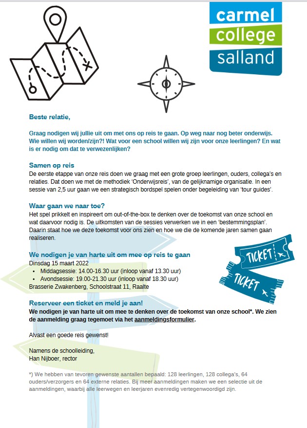 Carmel College Salland in Raalte nodigt leerlingen, docenten, ouders en externe relaties op 15 maart uit voor samenkomsten in Brasserie Zwakenberg om te brainstormen over de toekomst.