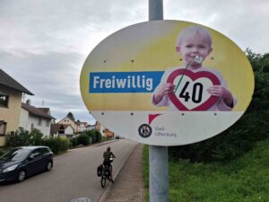In Duitsland trof ik een bord langs de weg met het ‘hart’-elijke verzoek niet harder dan 40 te rijden. In Raalte werkt een stopverbod niet, dus hebben ze er een geel vlak achter gezet. Maar nu zag ik laatst dat dat nog steeds niet genoeg is. Er lichten nu ook lampen op in het wegdek…