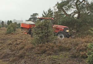 De route voert me nu omlaag langs de bosrand en voor me uit zie ik rook- en stofwolken boven de heidevelden. Daar wordt “nieuwe natuur” gemaakt door grote bulldozers en zware trekkers met laadbakken waarin de oude natuur wordt afgevoerd.
