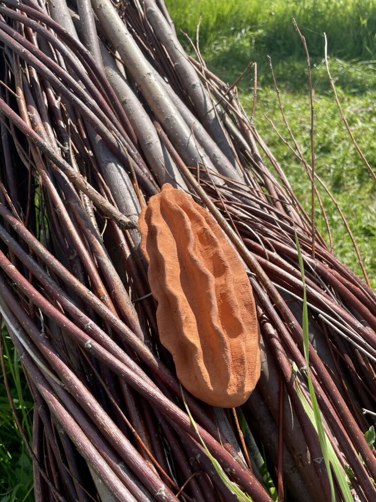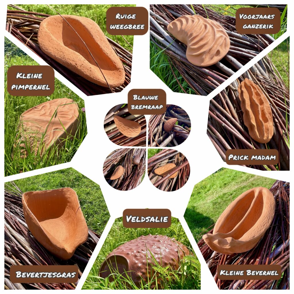 Van de verschillende zaden die meegevoerd zijn vanuit de bergen heeft Carmen 8 zaden uitvergroot en en verwerkt met rivierklei in haar kunstwerk, ‘Stroomdalflora van de bergen’
