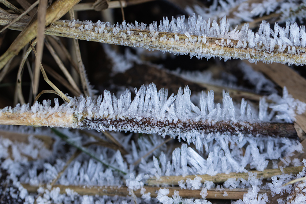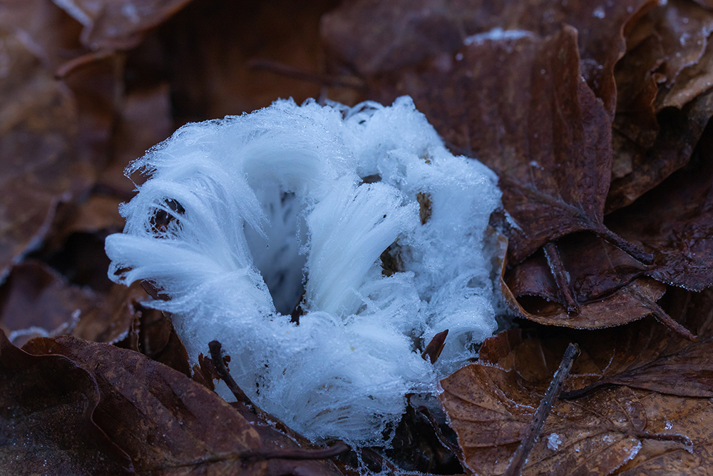 Blaadjes, uitgebloeide bloemen, takjes en bessen zijn getooid met de mooiste ijskristallen en je kunt nu ook weer dat bijzondere ijshaar vinden.
