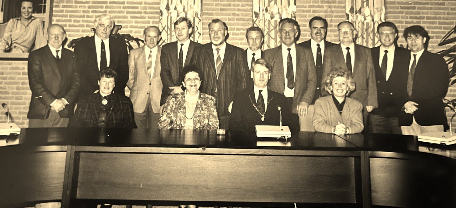 Met op de bovenste rij van links naar rechts de raadsleden Overmars, Otterman, Heideman, Pol, wethouder Letteboer, van Houte, Ankoné, Burke, wethouder Stap, gemeentesecretaris Schemmekes en ondergetekende. Best een dikke kop toen, enfin. Met op de voorste rij de raadsleden Schrijver, Jacobs, burgemeester Polderman en Weide.