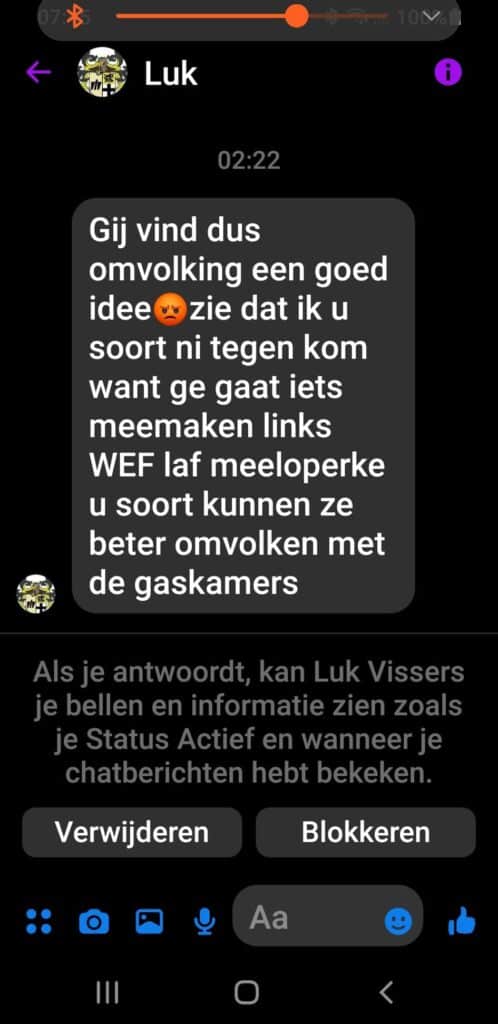 Veel mensen hebben achter het toetsenbord veel meer lef dan in het normale leven, waardoor discussies vaak escaleren en de meest afschuwelijke reacties geplaatst worden. Gebrek aan humor is ook een kenmerk van veel van deze toetsenbordhelden. Zo heb ik in mijn Facebookprofiel staan dat ik geraniumverzorger ben om aan te geven dat ik gepensioneerd ben. Vaak boze reacties dat ik me maar met mijn stomme geraniums moet bezighouden of dat ik meer verstand van geraniums heb. Omdat de coronapandemie wat uit beeld is geraakt en het nog te vroeg is om over Zwarte Piet te gaan zeuren heeft Thierry Baudet op dit moment als speerpunt omvolking. Hiermee bedoelt hij dat het een bewuste politiek is van het WEF, Agenda 2050 en The Great Reset om immigranten hier naar toe te halen om deze te laten vermengen met de autochtone boerenkoolkoppen om onze cultuur te vernietigen, een theorie die hij gejat heeft van een lichtbesnorde Oostenrijker die een kleine eeuw geleden nogal wat in Duitsland te vertellen had. Toen ik op dit artikel reageerde dat uit de meeste reacties op het Forum voor Democratie platform wel blijkt dat deze omvolking hard nodig was, omdat er nu duidelijk sprake is van inteelt, kreeg ik deze liefdevolle reactie: