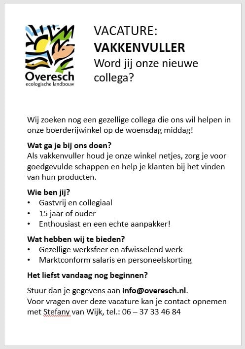 We hebben als doelstelling biologisch 100% bereikbaar te maken voor iedereen. In onze boerderijwinkel vind je een compleet assortiment aan biologische producten, zoals rund- en varkensvlees van eigen vee, kip van Polderhoen, groente en fruit, vers brood, zuivel, kaas, eieren, bier en wijn, en natuurlijk een groot assortiment aan droog- en kruidenierswaren. Mocht je producten willen die wij niet standaard in het assortiment hebben dan kunnen wij deze voor je bestellen.